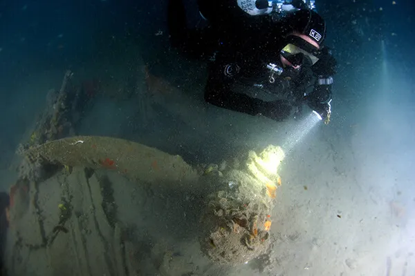 godina. Olupinu tada nepoznatog zrakoplova, pozicioniranu zapadno od otoka Unije, otkrio je naš prijatelj Davor Buršić iz partnerskog ronilačkog centra Shark diving i tu informaciju ljubazno podijelio s nama. Iako je lokacija olupine kao ronilačka pozicija ušla u turističku ponudu tog poznatog medulinskog ronilačkog centra, relativno je mali broj ronilaca koji su pohodili olupinu zrakoplova. Razloga tome je više, a neki od njih su znatna udaljenost od Medulina, zaron “u plavo“ na otvorenom moru, uobičajeno loša vidljivost zbog djelovanja ribarskih koća i morskih struja koji podižu okolni sediment u većoj mjeri, kao i dubina lokaliteta od 51 metra koja je sportskim roniocima bez plinskih mješavina izvan svih sigurnosnih standarda. Dio ekipe Wreck Hunters Adriatic je u cilju identifikacije zrakoplova napravio dva vrlo zahtjevna zarona u uvjetima loše vidljivosti, sa, za tu priliku, posebno pripremljenim mješavinama plinova i prilagođenom konfiguracijom opreme. U prvom smo zaronu dolaskom na lokalitet utvrdili da je olupina zrakoplova devastirana koćarskim mrežama do