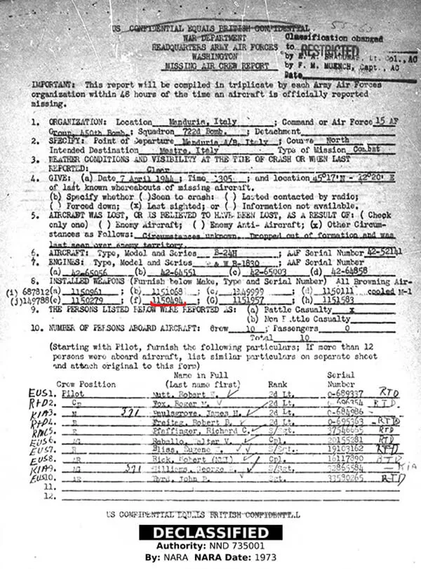 → armije te su nakon rata umirovljeni. Zanimljive zapise, koji idu u prilog tehničkoj neispravnosti kao uzroku pada zrakoplova, ostavili su članovi 722. eskadrile 450. bombarderske grupe Adam E. Wood i Walter J. Kostro koji su bili dio originalne posade, od strane Wreck Hunters Adriatic, identificiranoga B-24 42-52141 Termite Chasera.